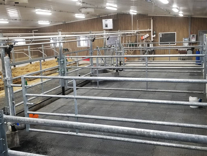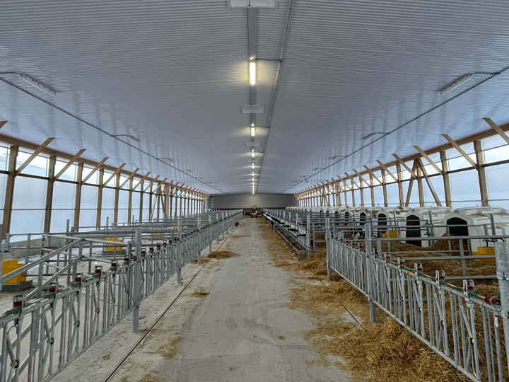 A great looking calf barn featuring half individual calf hutches and half group pens with group hutches, Jourdain headlocks and gates.